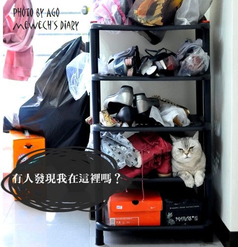 <!-- Origin Article URL: http://www.wretch.cc/blog/mewech/21336240 --> <br/> <img alt="" src="http://pic.pimg.tw/mewech/4b2d1ca7d1433.jpg?v=1261247656"/><br/> <br/> 繼上回<a href="http://www.wretch.cc/blog/mewech/20765865" target="_blank">妹妹躲貓貓</a>後,<br/> 推出了第二式,<br/> 請猜猜妹妹在哪?<br/> <br/> 大家剛開始看到時,<br/> 都直呼「好可愛好可愛哦...」<br/> <br/> <br/> <br/> <img alt="" src="http://pic.pimg.tw/mewech/4b2d1ca8abf81.jpg?v=1261247656"/><br/> <br/> 猜到了嗎??<br/> 妹妹這回和鞋架融成一體,<br/> 露出肥肥臉和肥肥手。<br/> <br/> <br/> <img alt="" src="http://pic.pimg.tw/mewech/4b2d1ca91318a.jpg?v=1261247657"/><br/> <br/> 像不像代言紅色的靴子呢?<br/> 人客仔,來買一雙哦~~~<br/> <br/> <br/> <br/> <img height="400" alt="" src="http://pic.pimg.tw/mewech/4b2d1ca9a1aed.jpg?v=1261247658" width="600"/><br/> <br/> 要不然, 附贈妹妹一枚,<br/> 當你家裝飾玩偶一天,<br/> 也很好搭哦。<br/> <br/> <br/> ps. 貓咪都很會躲在讓人意想不到的地方, 有時看到真的很好笑咧....<br/> <br/> <br/> <br/> <br/> <br/>
